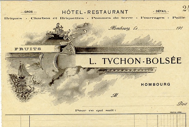 Comme l' indique le bon de commande vierge, datant des des années 1910, les Tychon-Bolsée tenaient un Hôtel-Restaurant. Ils vendaient également des fruits, des briques, du charbon, des briquettes, des pommes de terre, des fourrages et de la paille. Ces activités étaient liées à la ligne de chemin de fer qui passait en face de leur commerce. La majorité de ces activités a continué durant le vingtième siècle, l' hôtel-restaurant, ainsi que le commerce des fruits et des briques disparaissant, tandis qu' apparaissait dans les années 1970 le commerce du mazout.
