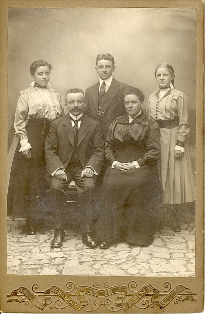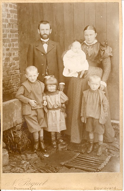 Léon TYCHON - Marie-Marguerite BOLSEE (assis) Toussaint BRUWIER - Julie SCHYNS avec Lambert Bruwier dans les bras (2nd rang) Léonie Tychon - Alfred Tychon - Elise Tychon (debout) Toussaint Bruwier - Justine (Titine) Bruwier - Gaspard Bruwier (1er rang)