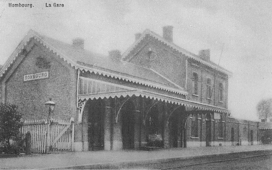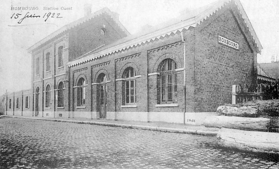 Les deux photographies ci-dessous présentent la gare de Hombourg (LMB) de face en 1922 et de derrière, côté de la ligne de chemin de fer. Cette gare se situe en face de la maison des Tychon. La gare a cessé son activité le 2 juin 1957 pour les voyageurs, et le 31 août 1962 pour les marchandises.